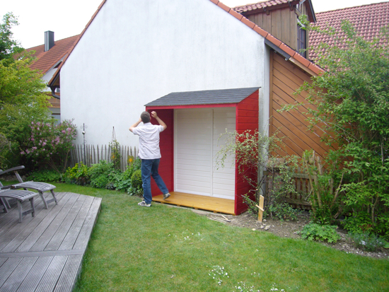 Nein - Ich habe kein weiteres Jahr gebraucht! Inzwischen sind die Platten verlegt, der Rasen ist soweit neu gesät und sogar schon gewachsen und im Inneren habe ich ein paar Ablagefläche geschaffen. Der Küchenblock, der später links neben den Gasgrill kommen soll ist auch schon vorhanden, aber noch nicht am Platz, da erst der Grill montiert werden müßte. Konjunktiv deswegen, da dieser in der Anschaffungsprorität hinter zwei neuen Autos zurückgefallen ist. Das erste Auto wird Mitte Oktober geliefert, das andere Anfang nächsten Jahres. Wenn dann mal wieder Geld übrig ist....
